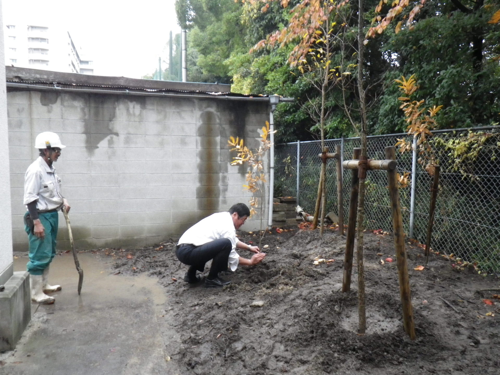 1年生の生徒のみなさんと一緒にクヌギを植えるというスケジュールでしたが、 植樹当日はあいにくの雨、急きょ雨バージョンに変わりました。